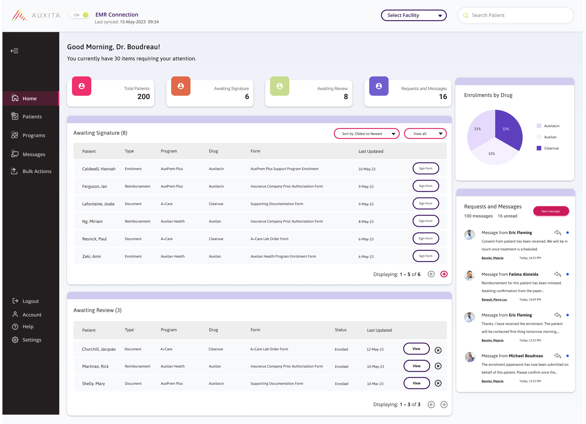 - Auxita only accesses and utilizes data needed to complete tasks specific to the PSP, such as Enrolment and Prior Authorization. No patient data is sent from Auxita to third parties (such as the PSP) without the expressed consent from the physician/clinic. Auxita will never share or sell patient data. All data is stored in Canada and is always encrypted whether in motion or at rest.